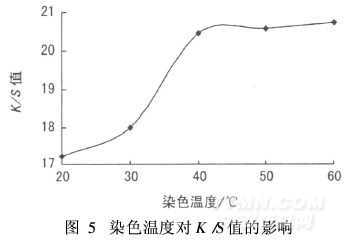 由图5可知,随着温度的升高,改性织物K/S值随之增大,因为温度升高,染料的扩散速率和上染率增加[7]。当染色温度达到40℃后,改性织物K/S值随温度变化不大。由于改性后织物与染料的反应性增加,即使在低温时,染料对纤维的上染率也很高,故选择染色温度为40℃。