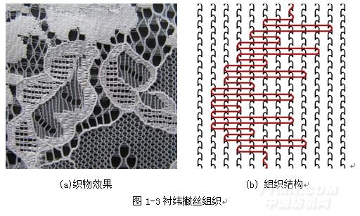 撇丝组织有压纱撇丝组织和衬纬撇丝组织两种。图1-3是衬纬撇丝组织,在衬纬组织的基础上,通过梳栉针背横移的长短变化所形成的花纹效应,有类似于刺绣效果。