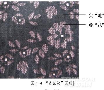 随着多梳拉舍尔花边工艺技术的提高和人们审美观点的多元化,多梳拉舍尔服装面料的表现形式也多种多样。花边中的“花”与“地”的角色和地位可以相互交换,在同一块面料中有主次之分,而在整个多梳拉舍尔服装面料的结构中无主次,各有自己的特色组织结构。“花”不只是实的, “地”也不只是虚的。花边中把“花”设计成镂空的,“地”设计成实的,形成的织物实中有虚,这种花纹称为“负花纹”。如图1-4所示。“负花纹”的组织结构与普通花纹正好相反,是花梳用来形成实“地”,地梳或贾卡梳用来形成虚“花”。
