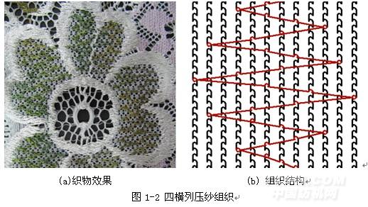 多梳拉舍尔服装面料的花型之所以变化丰富,一方面是因为花型种类繁多,另一方面形成花型的组织结构也有多种,除了常用的压纱组织和衬纬组织之外,还有这两种组织的变形组织,如双列衬纬组织、多列衬纬组织、双列压纱组织、多列压纱组织以及撇丝组织等。