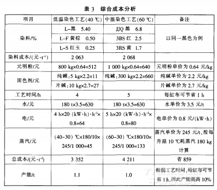 2.1中所述的两种工艺进行加工.其综合成本分析如表3所示 经实践发现.大生产过程中.低温染色工艺中的纯碱用量可调整为0.5 g/L