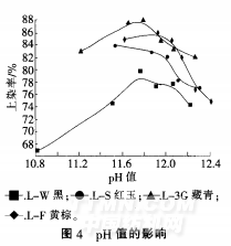 由图4可看出.低温L型活性染料的最佳固色DH值为11.7~12_2,当pH值小于11.7或大于12-2后.染料上染率会不同程度下降通过实践发现.对于低温L型活性染料.在固色温度40℃.固色时间60 min时,使用复合碱在pH值11.7~12.2之间均可得到最佳的染料上染率
