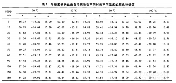 2.2动力学方程及参数 为全面研究叶绿素铜钠盐在羊毛纤维上的染色 动力学特征,找到最适合描述此染色过程的动力学 模型,本文选用2种动力学模型对叶绿素铜钠盐染色毛织物在不同时刻不同温度的吸光度、上染百分 率及每克织物上的染料量数据进行拟合。