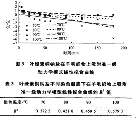 式中:Q 为吸附平衡时纤维上叶绿素铜钠盐的含量 (mg/g);Q 为时间 时纤维上叶绿素铜钠盐的含 量(mg/g);k 1为一级动力学反应速率常数 (min-1 )。式(5)通过积分后将临界条件T:0时, Q t=0时和T=t时,Qt =Qe 代入,简化得到: ln(Qe 一Qt )=lnQe 一k 1T (5) 式(5)中以In(Qe 一Qt )为因变量, 为自变量作图, 可得到一条直线,并计算出反应速率常数k 。如果 吸附在一种界面上进行,大多数实验遵循准一级动 力学模式。如果实验结果不符合式(5),说明这个 过程不符合一级动力学方程。用式(5)进行线性拟 合得到叶绿素铜钠盐对羊毛织物吸附的准一级动力 学模拟曲线,如图3所示。由图3可以明显看出拟 合情况不理想,而表3叶绿素铜钠盐不同温度下在 羊毛织物上吸附准一级动力学模式线性拟合曲线的 R 值表明,回归系数R 值过小,这些结果均说明准 一级动力学模型不能准确描述叶绿素铜钠盐在染羊 毛纤维上的染色动力学。