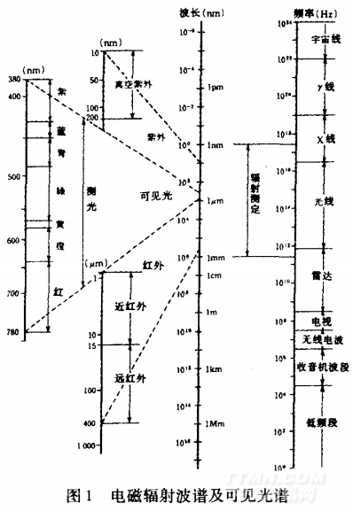 光是一种电磁波。电磁波的波长范围宽广,低至1 nm以下,高达10 km以上。其辐射类型包括宇宙射线、x射线、紫外线、可见光、红外线、雷达、无线电和电视广播、交流电等(如图1