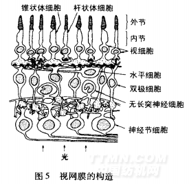 图5中,入射光沿图中箭头方向射人,到达具有感光性能的视细胞;视细胞层的表侧是视神经层,它由水平细胞、双极细胞、无长突神经细胞、神经节细胞等组成,由视神经层处理来自视细胞的信号。因此,入射光是通过透明的视神经层后才到达视细胞层的。