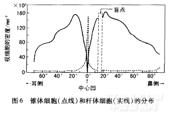 网膜上的视细胞分布如图6所示 ‘。 ,其中锥体细胞集中在视轴近旁(中央凹)。中央凹是直径约为1.5 mm的极小区域,这里锥体细胞的分布非常密集,约有10—15万个,分辨能力最高;与此相反,杆体细胞在视轴近旁数量极少,而广泛分布在此区以外的部分。由于杆体细胞在暗视觉条件下起作用,所以用斜视眺望夜里的星星时会感到更明亮就是这个道理。