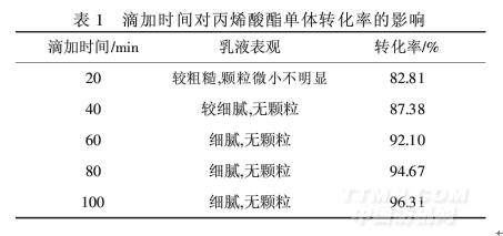 由表1可知,随着滴加时间的延长,单体残留量减少,转化率提高.在滴加60 min时转化率已达92.10%,但滴加时间过长,生产周期也延长,增加产品成本.考虑后续保温阶段可以进一步提高单体转化率,故选择滴加时间为60 min.