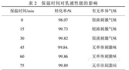 由表3可知,当m(OP-10)∶m(LAS)=2∶1时,转化率很高,凝胶率很低,故选择此比例为乳化剂配比.