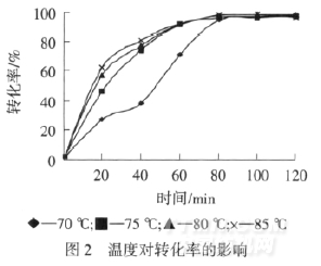 由图2可知,温度太低聚合反应速度较慢,反应不完全,80℃时总体转化率达到较大值.继续升高温度,转化率不再上升,甚至有下降趋势,且当温度过高反应热很难控制,生成的乳液稳定性变差,出现凝胶,影响粘合剂的性能.因此,选择反应温度为80℃.