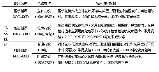 锦纶、涤纶和粘胶是拉舍尔花边的常用原料。这三种原料不同的染色特性说明通常花边的套色有单色、双色和三色,此外段染纱、金银丝、玻璃丝等新颖纱线的应用使花边色彩可根据设计需求有更大的发挥空间,使花边的色彩层次更加丰富。需要注意的是,随着花边织物对手感和服用舒适性要求的不断提高,在设计时原料选用的基本原则是以锦纶为主,其他均作为局部勾勒或者点缀使用。