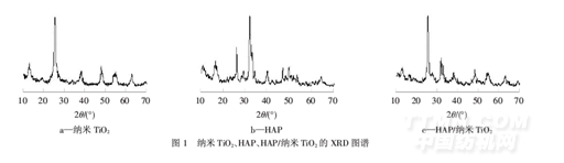 取一定量上述羟基磷灰石溶解于0.1 mol/L HCl中,再取一定量纳米TiO2溶解于蒸馏水中,超声波分散15 min制成TiO2悬浮液;将2种溶液混合后逐滴加入氨水,调节pH=11~12,在90℃下恒温6 h,充分反应后进行水洗、醇洗,干燥后得HAP/纳米TiO2复合材料.