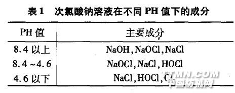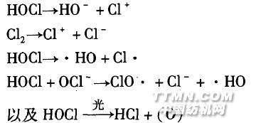 次氯酸钠溶液是强氧化剂,产生漂白作用的主要是OC1-、HOC1和cl2,但它们在溶液中的含量是随着PH值的变化而变化。在碱性条件下主要是OC1-,近中性范围内HOC1和OC1一的浓度积为最大,在弱酸性条件下则以HOC1.为主。而cl2的含量是随着PH值的降低而增大,在PH值低于4以下成为主要成分。次氯酸钠溶液的漂白速率随着溶液PH值的降低而加快,当漂液的PH值大于4到碱性范围内,HOCl含量是随着PH值的增大而减少,而漂白速率也降低。PH值在4到碱性范围内HOCl是主要漂白成分,漂液在碱性条件下时,Cl2 的含量很微。次氯酸钠漂白作用比较复杂,在不同的条件下,是不同的成分在起作用,HOCl和cl2可发生各种形式的分解,分解反应如下: