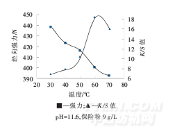 图1不同碱剂、不同pH对织物经向强力和染色K/S值的影响