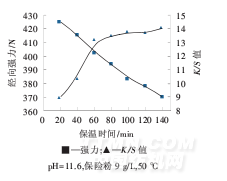 由图4可知,随着染色时间延长,强力损失增加;当染色时间小于50min时,染色织物的K/S值随着保温时间的增加而增大,大于50min后,染色织物的K/S值变化趋缓.综合考虑,还原紫2R上染真丝最适宜的染色时间为50min,此时织物经向强力为402.14N,强力损失率为15.40%,K/S值为11.32.