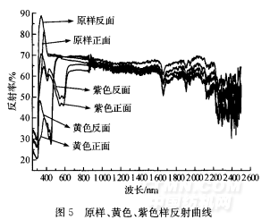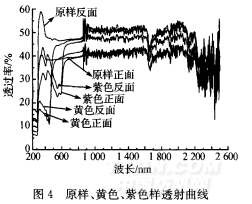 为了测试染色后对窗帘透光、隐视功能的影响,本实验按不同色系分别试染了黄色、紫色两种颜色 的面料,对织物透过率和反射率进行测试,结果如图4、图5所示。并对其光学性能与原样进分析对比。