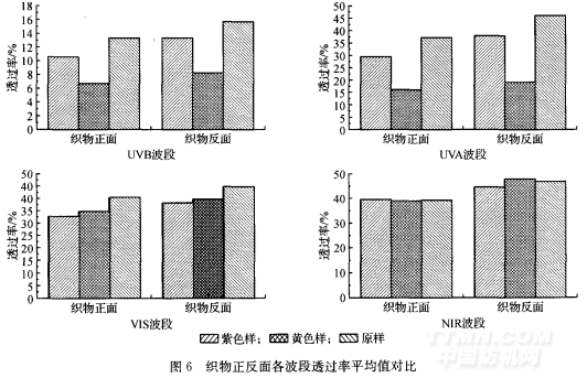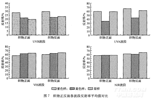 从图7中可以看出,在UVB波段,紫色样正反 在VIS和NIR波段,黄色和紫色样正反面反射 面反射率比原样和黄色样高,在UVA波段,紫色样 率比原样也有所减少。在vIs~a,黄色样反射率值正反面反射率与原样几乎一样,均高于黄色样。 下降得比较少,正反面反射率达到62.O6%oN62.90%,与原样相比减少了1.24 和1.8 ,在NIR波段,黄色和紫色反射率与原样相比虽然有所减少,但是十分接近,对反射率影响同样不大。从图6、图7中看出,在紫外线和可见光波段,染色后织物的平均透过率均低于原样。说明染色会削弱Tricot 經編織物的透光,隐视的效果,但是可以提高紫外線的防護能力。