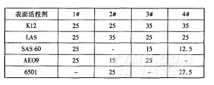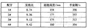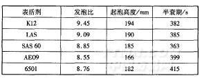 由于光亮涂层胶是阴离子乳液,因此起泡剂主要选用阴离子型和非离子型表面活性剂进行复配。但涂层胶只要求涂覆于织物表面,而不需具有渗透性,所以选定K12(月桂基硫酸钠)、LAs(十二烷基苯磺酸钠)、SAS60(仲烷基磺酸钠)、AEO9(脂肪醇聚氧乙烯醚)和非离子表面活性剂6501作为发泡剂,且各取质量浓度为10L,不同表面活性剂水溶液的各项发泡指标见表4。不同配方起泡剂的发泡性能见表5和表6。