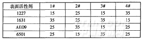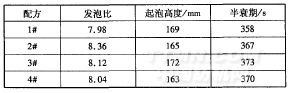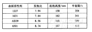 由于柔软剂都是阳离子或弱阳离子型产品,所以起泡剂不宜选择阴离子型表面活性剂。各取质量浓度为10g/L阳离子型表面活性剂1631、1227和非离子表面活性剂AEO9和6501,其发泡各项指标见表7,柔软起泡剂的配方见表8,不同配方起泡剂的发泡性能见表9。
