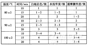 对深蓝色印花毛巾采用0.20g/L皂洗酶,测定不同皂洗温度和时间下的白地沾色牢度、水洗牢度和湿摩擦牢度,见表2。