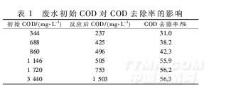 当超声频率为40kHz、功率为160W、水温为室温、超声辐照时间为150min、初始pH为9.25时,改变染料废水的初始COD,考察染料废水初始COD对COD去除率的影响,结果如表1所示。