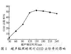 当超声频率为40kHz、功率为160W、水温为室温、初始pH为9.25时,改变超声辐照反应时间,染料废水COD去除率的变化如图1所示。