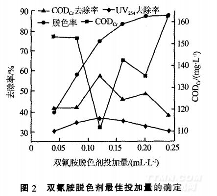 (2)先投加双 氰胺脱色剂.以200 r/min搅拌30 s,再加人PAC搅 拌30 s;