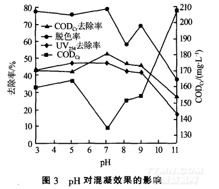 由试验结果可知,方式1、方式3 对CODcr 的去除效果最好(去除率分别为54.64%、59.99%).方式2最差(去除率为46.72%),据此后续 试验采用PAC与双氰胺脱色剂同步投加方式。2.3 DH对混凝效果的影响 用质量分数均为10%的稀盐酸和氢氧化钠溶 液调节水样DH,按最佳复合配比和最佳投加方式进 行混凝试验。结果见图3。由图3可见,该复合混凝 剂对DH的适应性较强。pH=3~9时去除污染物效果比较明显,CODcr去除率为42%~53%,脱色率为68%~78%.UV2s4去除率为41%一47%(pH在3~7时 基本维持稳定且略有上升趋势,pH在7 9时处理效 果略有下降),pH>9后明显下降。原因在于碱度太高 使得铝盐更多转化为A1(0H),胶体、[A1(0H) ]一、[A1(OH) ]:一等,这些水解产物带负电或不带电荷, 不能与负电性的染料胶粒表面发生电中和作用.且 吸附架桥作用减弱,混凝效果不好 ;此外pH增大, 复合混凝剂的荷正电率会降低[8].不利于与染料形 成缔合物(93。综上所述,pH为7时混凝效果最佳。弱 酸性效果好于弱碱性。