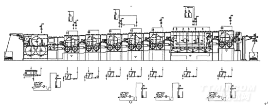 酸性印花织物水洗因容易沾色,目前国内大部分工厂一般都采用拉缸(绳状染色机)水洗。拉缸水洗的好处是能直观地看到织物水洗的效果,但是存在耗能大和效率低的缺点,已不适应目前的生产和发展要求。连续平幅水洗机采用喷淋冲洗、溢流、回流、低液位等多种综合措施,以提高净洗效果和提高效率,但是有的连续平幅水洗机无法达到低张力,产品也就很难达到高品质的要求。