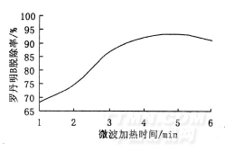 从图3看出,当微波功率一定时,复合催化材料的催化效果随着微波加热时间的增加而增大。但超过5min后,复合催化材料对罗丹明B的脱除率反而逐渐变小。这可能是微波辐射的时间越长,整个反应体系的温度越高,在较高温度下二氧化钛溶胶颗粒可能与膨胀珍珠岩中的Na+、K+、Mg2+等金属离子形成钛酸盐,这些金属离子的钛酸盐是光生电子和空穴的复合中心,加快了光生电子和空穴的复合,导致TiO2/EP复合催化材料的催化活性下降。因此确定微波辐射时间不能太长,以5min为佳。
