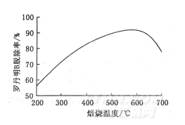 由图4可以看出, TiO2/EP催化性能在200~600℃范围内随着焙烧的温度升高而增强,对罗丹明B的脱除率逐渐增大;当温度高于600℃以后,其催化性能随着焙烧温度的升高而减弱。这是因为TiO2主要由金红石型、锐钛矿型二种混晶组成,当焙烧温度低于600℃时,微波制成的TiO2/EP催化材料主要以锐钛型TiO2存在,当温度高于600℃, TiO2/EP催化材料由锐钛型转化成金红石型。金红石型TiO2的折射率比锐钛型高,遮盖力和着色力也高,其比表面积小,光催化性能小;而锐钛型TiO2在可见光短波部分的反射率比金红石型高,对紫外线的吸收能力比金红石型低,光氧化催化活性比金红石型高。因此,焙烧温度在550℃为好。