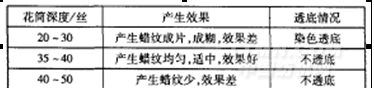 (4)毛效、丝光钡值要保证还原追印工序发色浓艳,白卷含潮均匀,在高温印蜡时有足够的水分受热汽化冲破蜡膜,从而使蜡膜龟裂产生肉眼不易察觉的裂缝,形成发丝蜡纹。