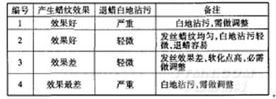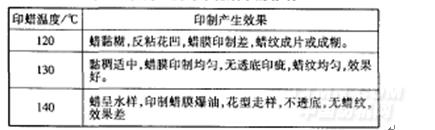 由表3可以看出,当花筒温度比蜡的软化温度高40~45℃时,产生蜡纹效果最佳。温度过低,印制困难,蜡纹成片或成糊,透底效果差;温度过高,蜡呈水样,曝油,无纹,花型走样,蒸汽压力大,效果差。