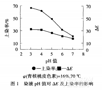 由图l可知,随着染液pH值的增大,染色织物的△E及上染率逐渐减小.如果染液的pH值太小,即酸性太强,则柞蚕丝织物的强力和性能等会有所下降.当染液pH值为4时,染色织物的△E为31.78,上染率为62.1%.综合考虑,选择染液pH值为4.