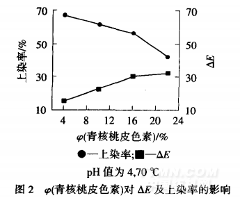 由图2可知,随(青核桃皮色素)的增加,△会逐渐增大,但(青核桃皮色素)=16%时,AE也基本达到一个饱和值,(青核桃皮色素)>16%后,△E增加速度缓慢.随(青核桃皮色素)的增加,上染率逐渐减小,但开始减小慢,当(青核桃皮色素)>16%后,上染率下降幅度较大.为使青核桃皮色素对柞蚕丝织物有较好的染色效果(aE大),而且还能保持青核桃皮色素有一定的上染率,不造成色素的浪费,选取(青核桃皮色素)=16%.