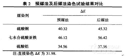 效果差.但不管是预媒法染色还是后媒法染色,都比直接染色提高了织物的色差值.经不同媒染剂媒染的△E大小顺序为七水合硫酸亚铁>硫酸铜>硫酸铝.