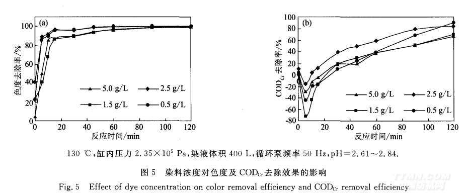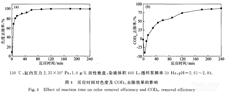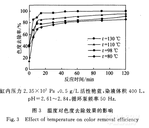 1)以CAS-85—4气垫式筒子纱染色机为反应器 时,WPO法处理印染废水的优化条件是:pH值为3 左右,温度130℃,反应时间为180min.在此条件下, 对于质量浓度为0.5 g/L的活性艳蓝染液,色度去除 率高于99.7 ,COD。 去除率为89.46 ,均满足GB 8978—88一级标准(色度80倍、CODcr 150 mg/L).对 于较高浓度染液(≥1.5 g/L),还需结合其他有效的后 续处理,CODcr 才能达标.