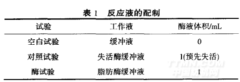 以0.05mol/LTris溶液和0.05mol/LHC1溶液配制不同pH值的Tris—HCI缓冲液(浴比1:100),按表1配制反应液.做对照试验时,在加入醋酸纤维前使脂肪酶预先失活(8o℃保温10rain).将预处理后的醋酸纤维在一定温度下反应一定时间,取出纤维,用1g/LNa2CO,溶液40℃洗涤1h,再用去离子水40℃振荡洗涤2次,每次1h,最后将纤维室温晾干
