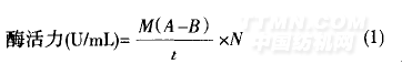 脂肪酶活力:取100mL锥形瓶2个,分别加入4mL橄榄油乳化液和5mL磷酸二氢钠一磷酸氢二钠缓冲液(pH7.5),置于40℃水浴中预热10rain.加入lmL酶液,立即计时,准确反应15min后迅速加入15mL乙醇终止反应.加入酚酞试剂2滴,用0.05mol/LNaOH标准溶液滴定至红色为终点.[5】记录耗用NaOH的量,按式(1)计算酶活.空白试验时,加入酶液前先加入乙醇.