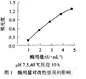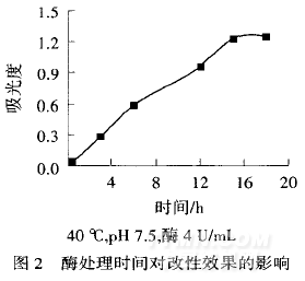 由图l可以看出,随着酶用量的增大,反应残液吸光度呈上升趋势,即酶催化纤维水解生成乙酸的量不断增加.但酶用量的增加与吸光度的变化不成正比关系.原因是酶用量较低时,纤维表面有足够多的作用位点,随着酶用量的增大,单位时间内发生水解反应的酯键增多;同时,酶是生物大分子,而醋酸纤维表面结构致密,脂肪酶的催化作用主要停留在纤维表面,很难进入纤维内部进行反应.因此,继续增大酶活,受作用位点的限制,酶的催化效率有所下降.