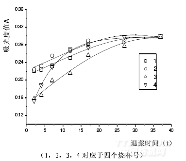 从图1可以看出,1,2二个烧杯中经过超声波预处理的淀粉酶退浆速率较3,4二个烧杯中的退浆速率在开始阶段明显要快得多,这一结果与(3.2)的结论是相一致的。其中在超声波中进行退浆的2号烧杯比在水浴锅中的1号烧杯退浆速率略快一些;而在超声波中进行退浆的4号烧杯与在水浴锅中的3号烧杯中淀粉酶的退浆速率相比,虽然一开始的时候速率相当,但在超声波中的4号烧杯中淀粉酶退浆速率迅速上升,这一结果清楚地说明了超声波对淀粉酶退浆工艺的促进作用。