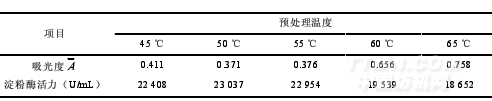 取5份10mL稀释酶液,分别在不同温度的超声波中预处理15min后取出。同上按(2.1)测定不同温度预处理后淀粉酶的活力,每个温度测定4次取平均值,测定结果如表6。