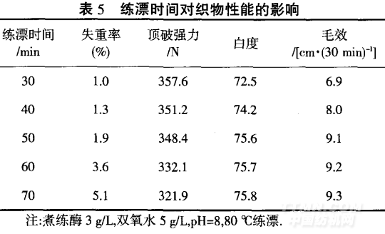 从表5可知,随着练漂时间的延长,虽然酶能够与双氧水充分发挥协同作用,但是织物表面的纤维素纤维发生了水解,使得织物的聚合度下降,则织物的失重率增大,强力下降;随着练漂时间的延长,杂质及共生物的去除,可使织物的白度和毛效得到提高.综合考虑,练漂时间为50 min比较适宜.