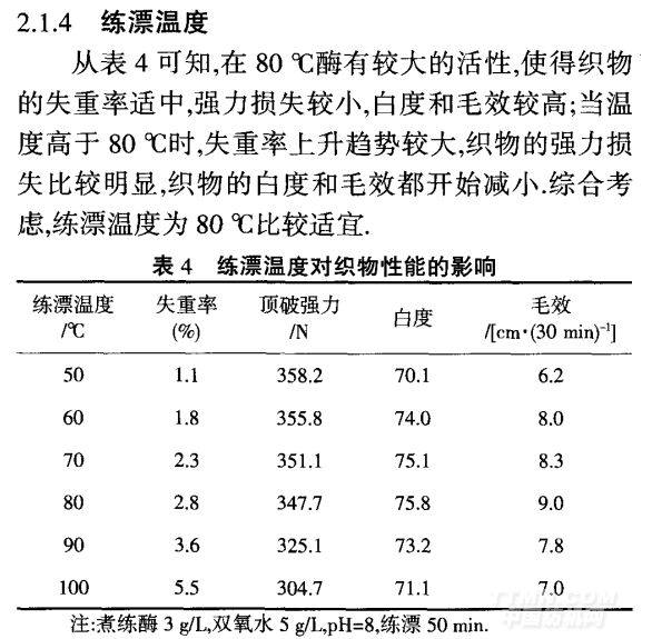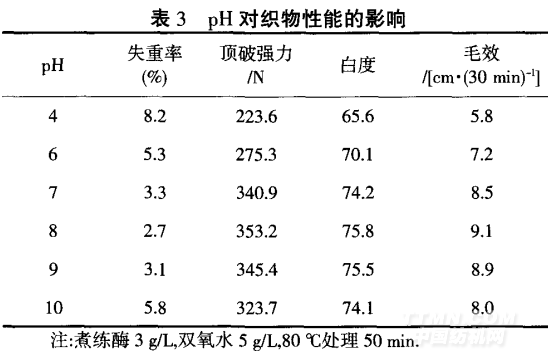 从表3可知,织物的失重率随着pH的增大先减 小后增大,而织物的强力随着pH的增大先增大后减 小,原因是强酸对纤维素纤维的损伤很大,纤维素发 生了降解,使得失重率较大,强力损伤严重;当pH=7~9 时,失重率明显比酸性条件小,对纤维素损伤较小;碱 性较强对纤维素也有一定的损伤,此时的失重率又有 明显上升,强力也有下降;织物的白度和毛效都随着pH的增大先增大后减小,但过酸或者过碱使得酶失 去活性,不能与双氧水较好的发挥协同作用去除杂质, 使得织物的白度和毛效变化都很小.综合考虑,选择 pH=8.