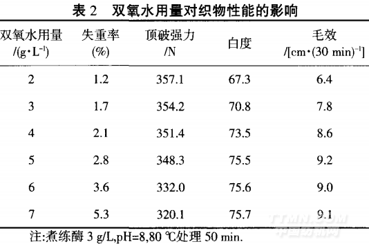 从表2可知,双氧水用量高于5 g/L时,织物的失 重率增大比较明显,主要是双氧水用量适宜时杂质氧 化溶解,而超过一定值以后,纤维素纤维被氧化(发生 降解),使得失重较大;当>5 g/L时,强力损失比较明显. 由于双氧水适量时是对杂质的去除,对织物强力影响 较小,当超过一定量后纤维受到了潜在的损伤,使强力 下降趋势明显;而双氧水用量超过一定值以后,对杂质 的去除作用减小,使得白度和毛效提高不明显.综合考 虑,选用双氧水用量为5 g/L.