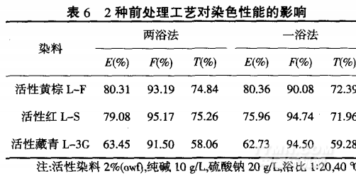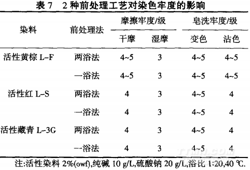 由表7可看出,染色后一浴法和两浴法的皂洗牢度和耐摩擦牢度较为接近,均达到服用要求,说明亚麻一浴法处理工艺完全可以满足生产需要,同时节约了大量的水电汽,符合十二五规划的节能减排要求,是较为经济环保的加工工艺.