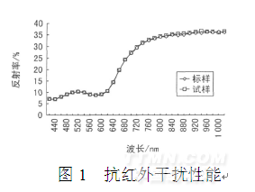 且在近红外波长区间740~1040nm,试样的反射率在30%~40%,可以达到抗红外干扰的效果。