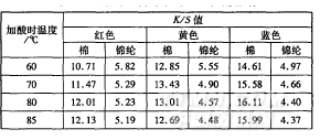 在活性染料2.0%(omf),元明粉60g/L,稳定剂1.5g/L,烧碱1.0g/L,冰醋酸3.0g/L条件下,考察加酸时温度对棉和锦纶染色K/S值的影响(表6)。