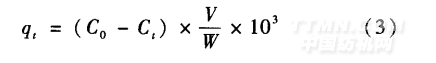 在式(2)中,以t/q 为因变量,t为自变量作图,可得到一条直线,进而求得平衡吸附上染量q 及速率常 数k。式中:q 为染色平衡时纤维上染料量(mg/g);q 为t时间时纤维上的染料量(mg/g);k为速率常数(g/mg·min)。其中纤维上的染料含量按式(3)计算得到。
