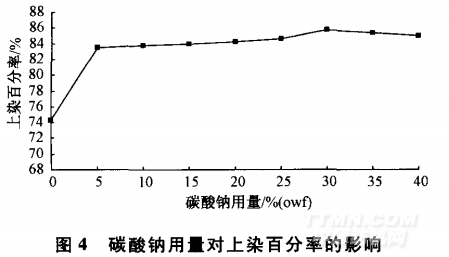 由图4可知,不加碳酸钠时,羊毛纤维的上染百分率只有74.26%;随着碳酸钠用量的增加,上染百 分率逐渐升高,当碳酸钠用量为30%(owf)时上染 百分率达到最高85.78%,继续增加碳酸钠用量,上 染百分率有下降的趋势。这是由于碳酸钠作为催化 剂,能够使WLS中的环氧基开环,随着碳酸钠用量 的增加,WLS中的环氧乙烷活性基团与羊毛纤维间 形成的交联共价键数量增加,改性程度提高,上染百 分率提高;但碳酸钠用量太大,上染百分率有所下 降,原因是碱用量太大,WLS水解速率增大,同时纤 维和WLS的共价键有可能发生断键。因此,碳酸钠 最佳用量确定为30%(owf)。